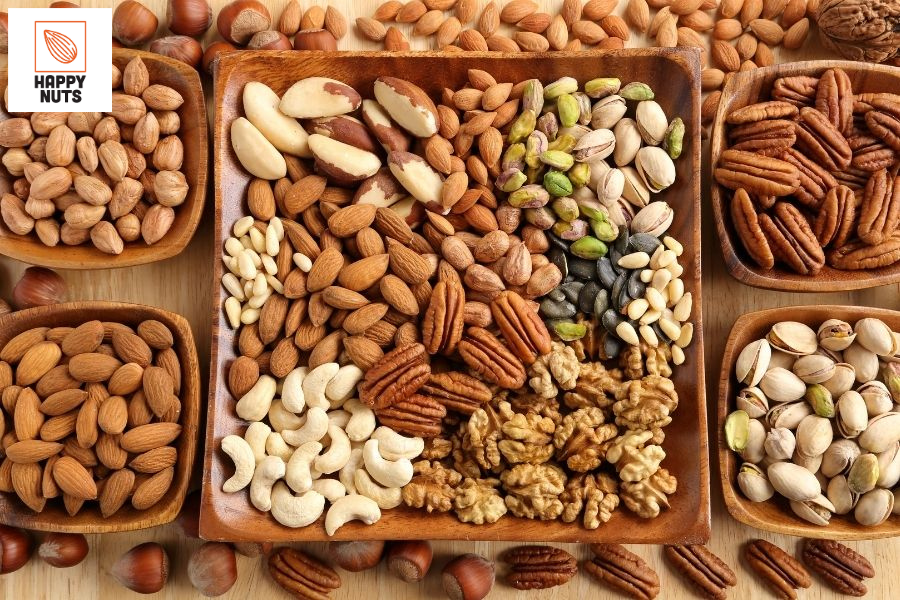 Tại Happy Nuts có đa dạng các sản phẩm cho khách hàng lựa chọn như hạt óc chó, macca, hạnh nhân, hạt điều, hạt dẻ cười, hạt chia, hạt bí, granola,…
