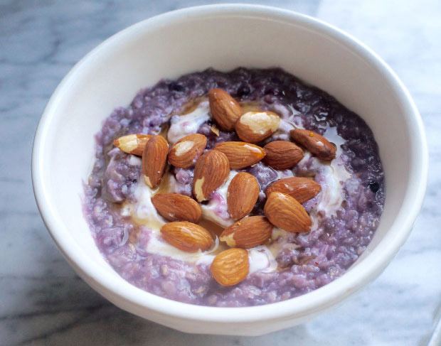 • Cho yến mạch, việt quất và nước vào một cái tô, đặt vào lò vi sóng khoảng 1 phút, sau đó khuấy chén yến mạch, và đặt vào lò vi sóng thêm 2 phút.