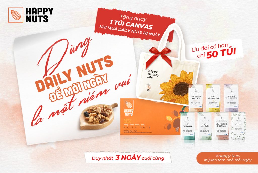 Happy Nuts đang có chương trình ưu đãi hấp dẫn dành cho 50 khách hàng khi đặt mua sản phẩm Daily Nuts và các loại hạt dinh dưỡng trong tháng.