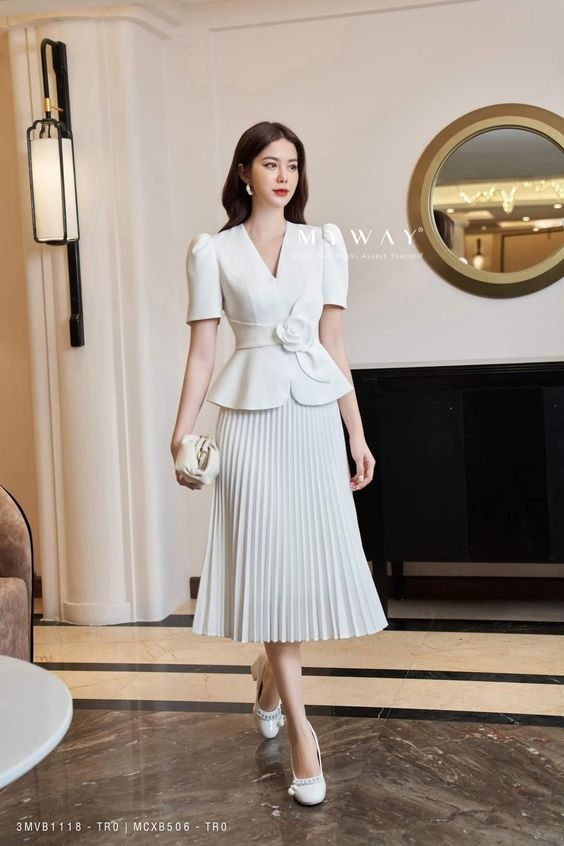 Tuy nhiên, nói như vậy không có nghĩa là đầm công sở dành cho người bụng to không được màu trắng. Bạn vẫn có thể chọn màu sắc này cho trang phục, tuy nhiên nên nhấn nhá hoặc kết hợp thêm với một màu trầm, tối khác để tránh mắt bị hút vào vùng eo trung tâm.