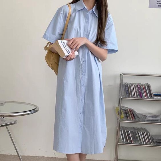 Thiết kế váy khá đơn giản, tương tự như chiếc áo sơ mi nhưng dài hơn thành váy và các hàng khuy chạy dọc thân váy mang đến cho người mặc diện mạo thanh lịch, trẻ trung.