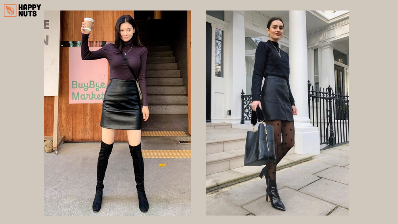 Áo cổ lọ vừa giữ ấm lại giúp phần thân trên của bạn trông dài hơn. Chân váy A ngắn giúp hack dáng cho đôi chân thêm dài.