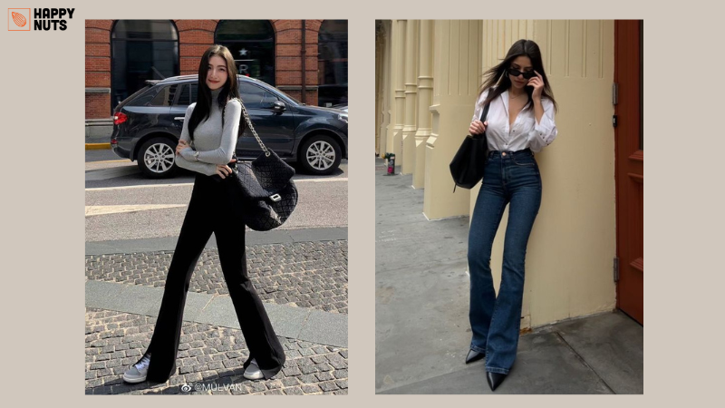 Với form quần ôm phần thân trên và loe dần xuống dưới, quần ống loe giúp tôn vòng 2 cũng như vòng 3 cho các nàng, phần loe nhẹ xuống mắt cá chân sẽ tạo hiệu ứng thị giác chân dài hơn.