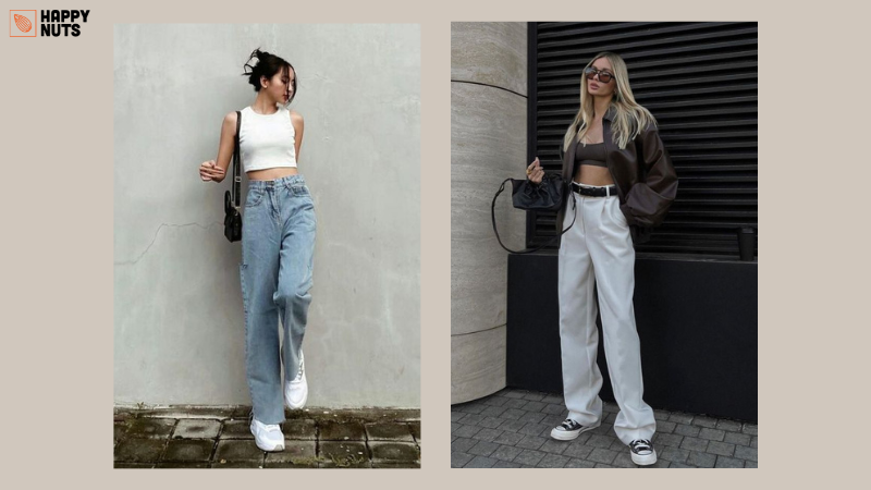2. Quần ống suông cạp cao cùng áo croptop và giày thể thao