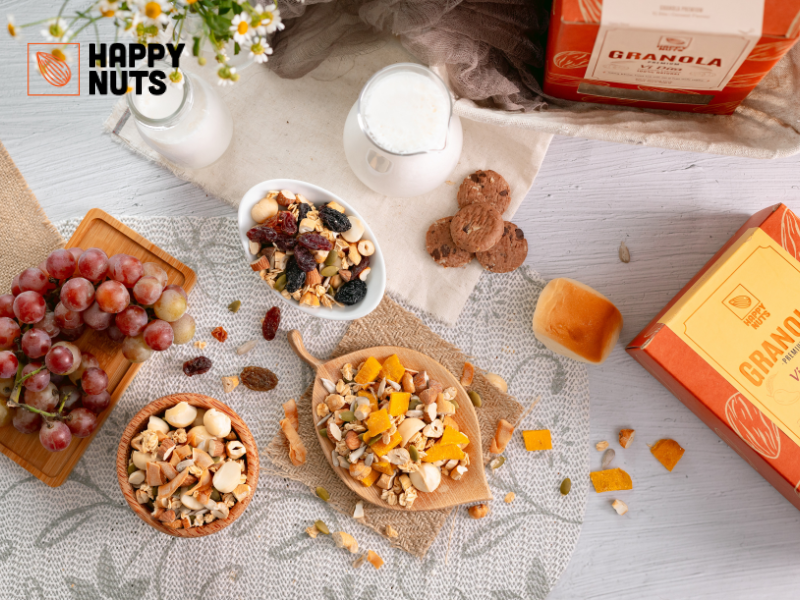 Với đa dạng các loại hạt dinh dưỡng khác nhau từ hạnh nhân, hạt điều, macca,…tới các sản phẩm Granola, Happy Nuts giúp khách hàng có thêm nhiều sự lựa chọn, giúp đa dạng thực đơn hàng ngày.