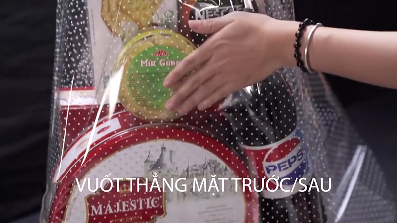 Giỏ quà Tết được gói bằng màng co có tính thẩm mỹ cao vì vị trí sắp xếp của các vật phẩm bên trong giỏ quà được cố định chắc chắn.