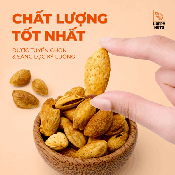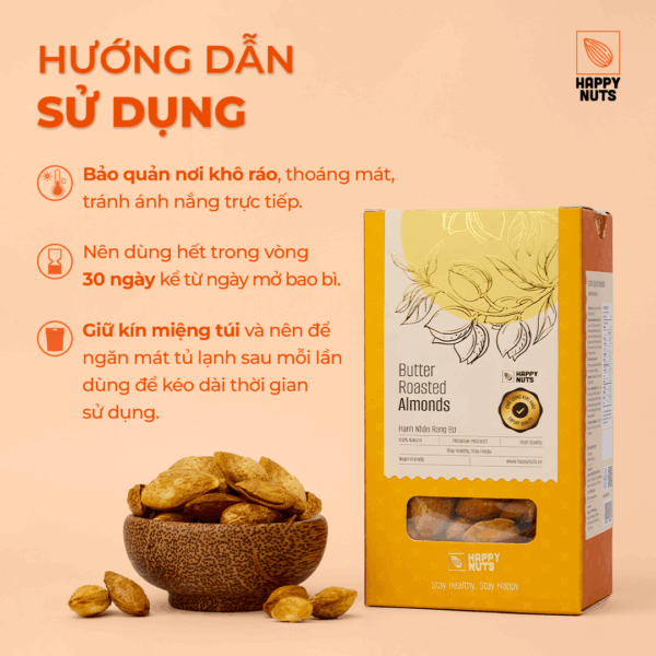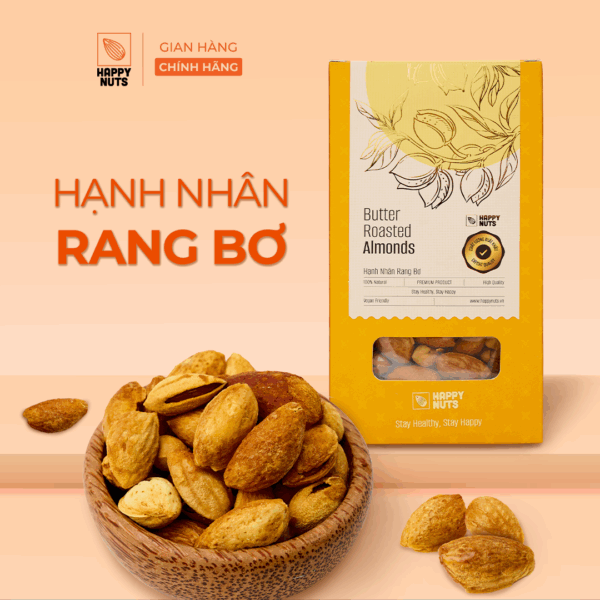 Hạnh nhân rang bơ Happy Nuts có hương vị đặc trưng, hòa quyện giữa bơ thơm ngon và vị ngọt của hạnh nhân. Một chút muối được thêm vào cũng tạo ra một hương vị cân bằng và thú vị.
