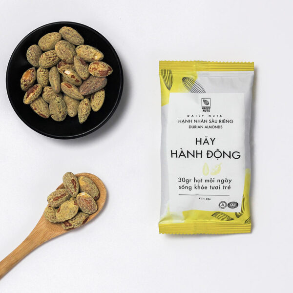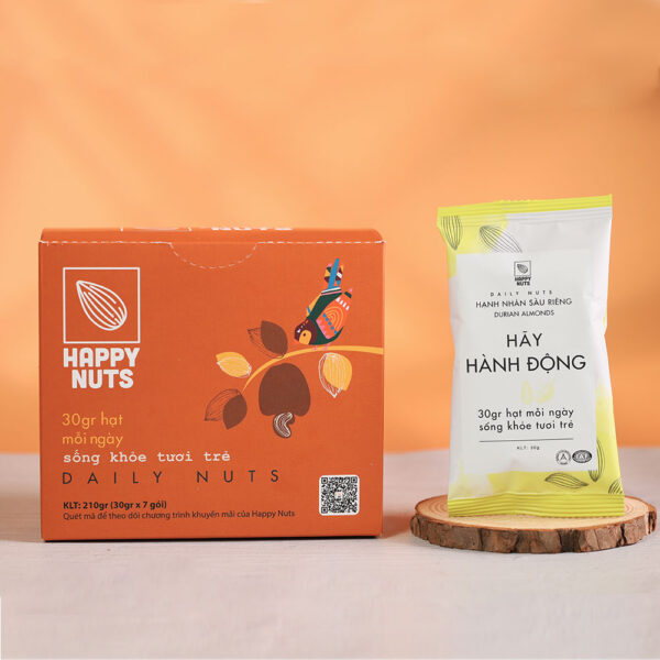 Hạnh nhân sầu riêng được đóng gói trong túi nhỏ 30g rất tiện dụng, có thể đem theo mình để ăn vặt bất kỳ lúc nào mà không phải lo bảo quản như loại hộp lớn. Dòng sản phẩm hạt ăn hàng ngày (daily nuts) của HAPPY NUTS còn có nhiều loại hạt khác để bạn có thể thay đổi khẩu vị. Trên bao bì mỗi loại đều có các thông điệp mà HAPPY NUTS muốn nhắn nhủ đến các bạn. Sống khỏe và tươi trẻ cùng Happy Nuts!