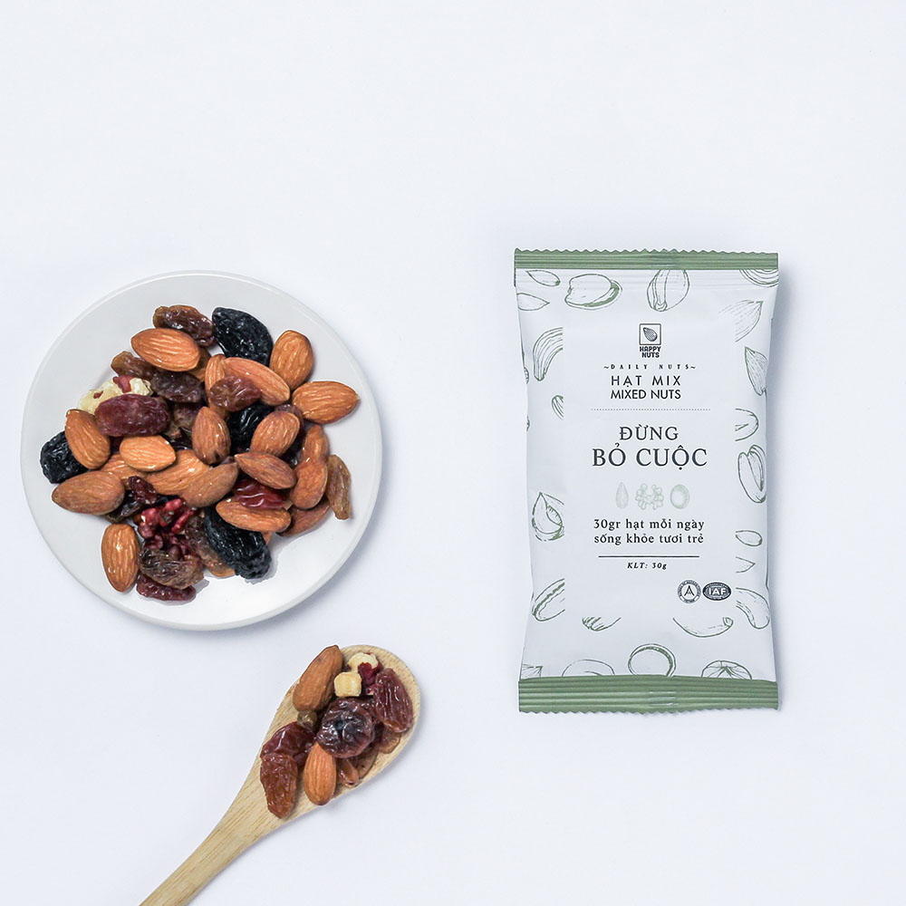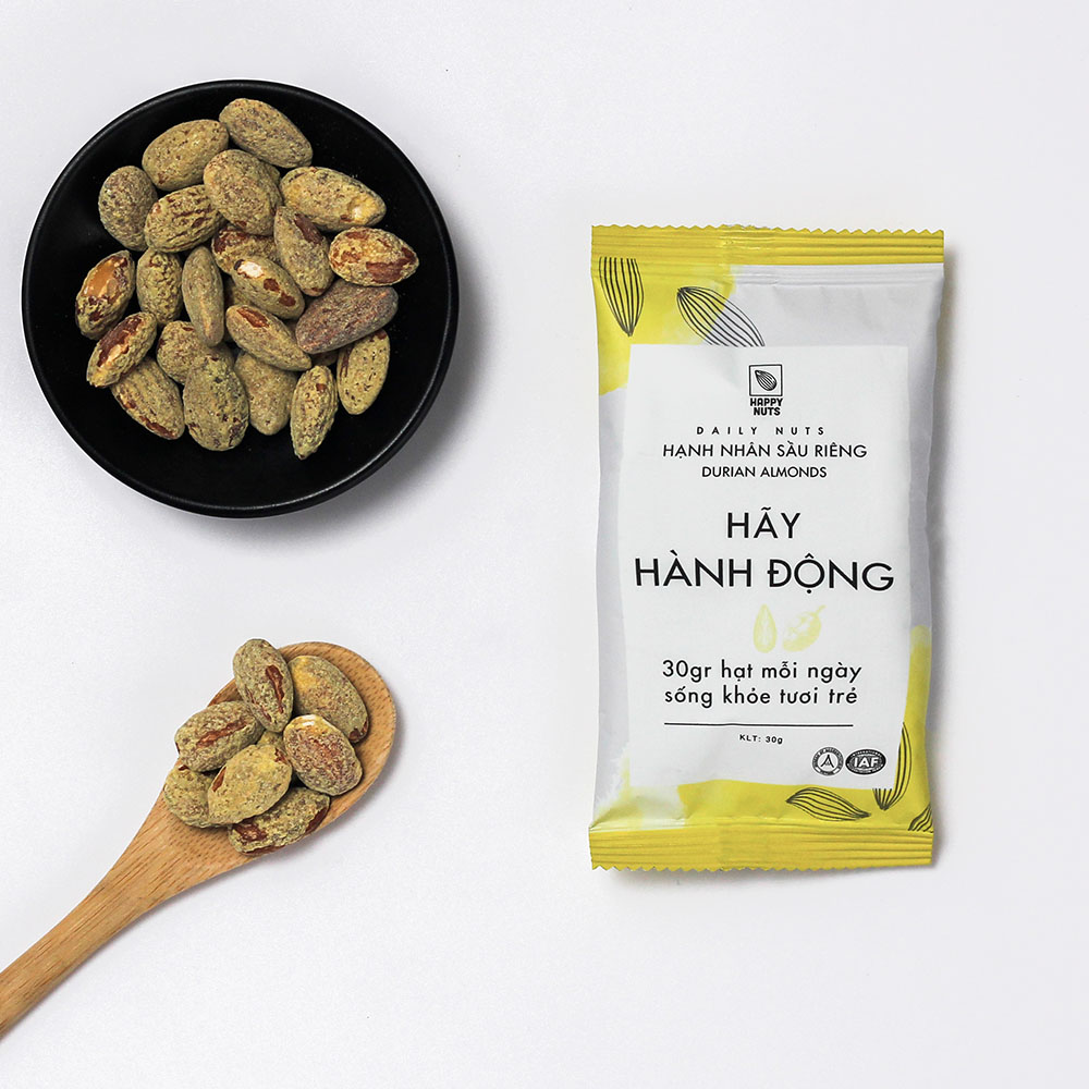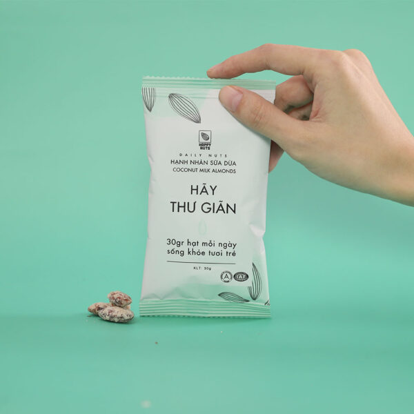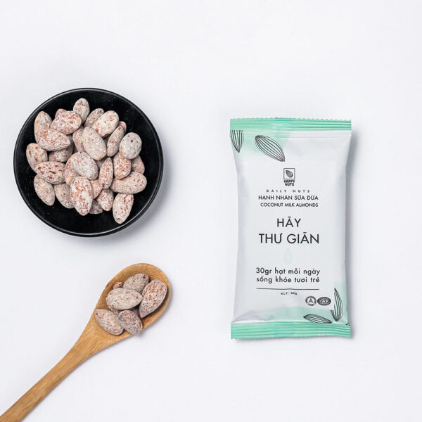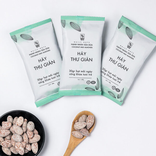 Hạnh nhân sữa dừa được đóng gói trong túi nhỏ 30g rất tiện dụng, có thể đem theo mình để ăn vặt bất kỳ lúc nào mà không phải lo bảo quản như loại hộp lớn. Dòng sản phẩm hạt ăn hàng ngày (daily nuts) của HAPPY NUTS còn có nhiều loại hạt khác để bạn có thể thay đổi khẩu vị. Trên bao bì mỗi loại đều có các thông điệp mà HAPPY NUTS muốn nhắn nhủ đến các bạn. Sống khỏe và tươi trẻ cùng Happy Nuts!
