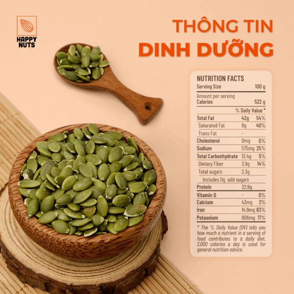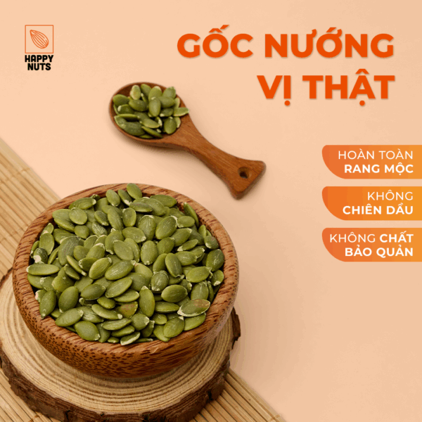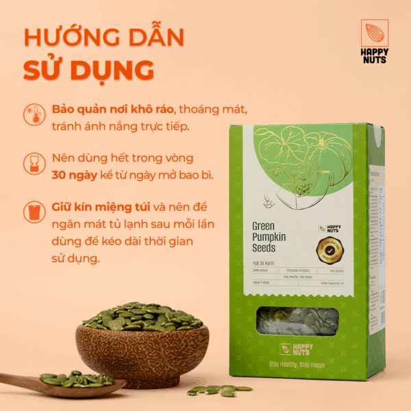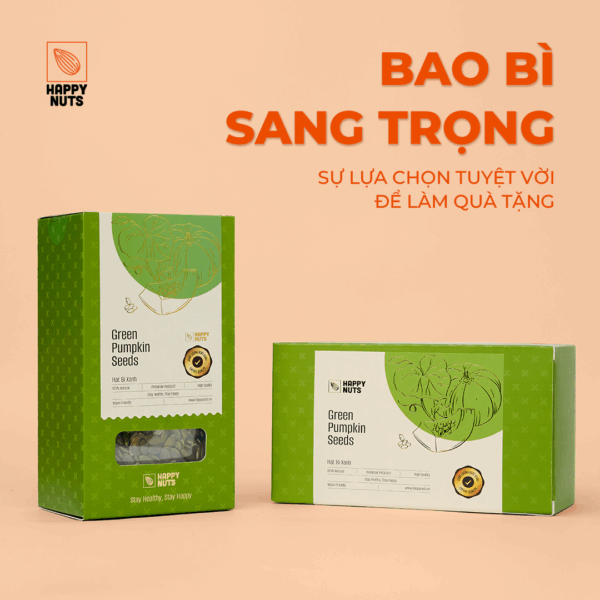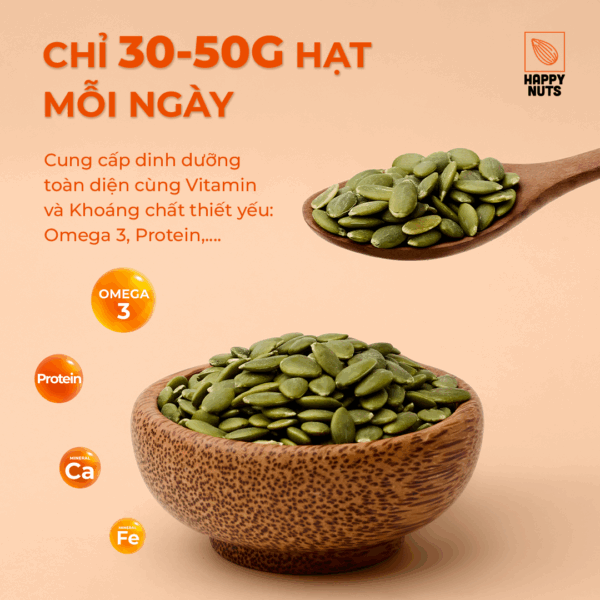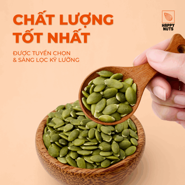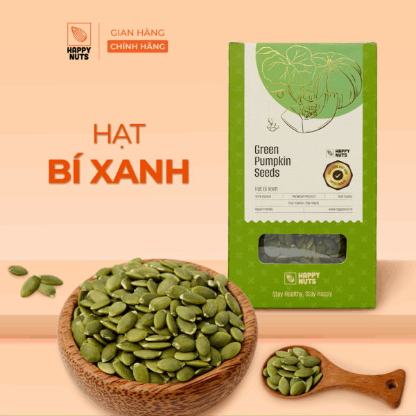 Hạt bí xanh tách vỏ Happy Nuts có xuất xứ từ Ấn Độ, không chỉ giàu dinh dưỡng mà còn có nhiều tác dụng với sức khỏe như giàu omega–3, ngăn ngừa bệnh tiểu đường, hỗ trợ tăng cường sức khỏe tim mạch. Ngoài ra, các chất chống oxy hóa trong hạt còn giúp giảm căng thẳng, tốt cho hệ thần kinh và ngăn ngừa ung thư.