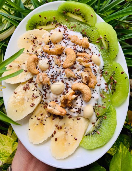Bước 2: Thêm hạt điều, trái cây lên trên như: chuối, dâu tây, kiwi,…