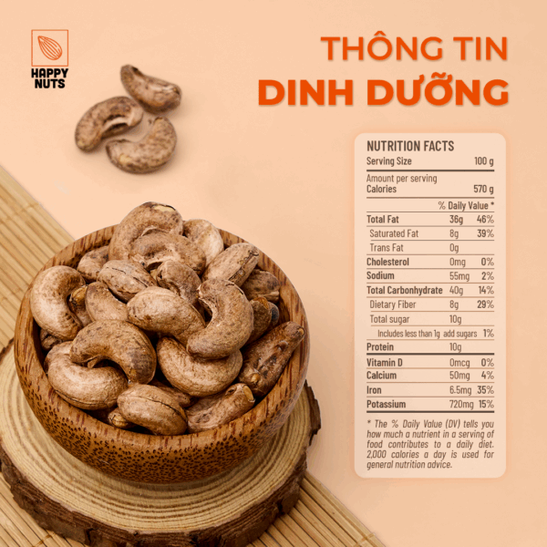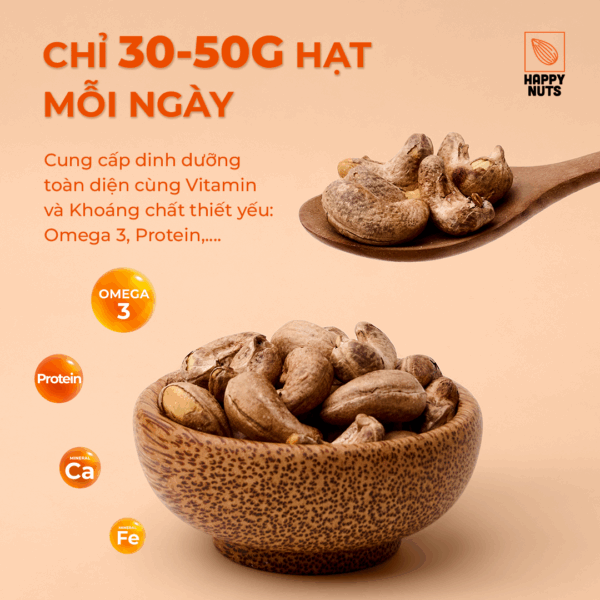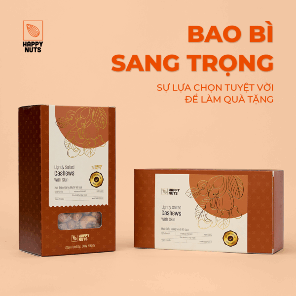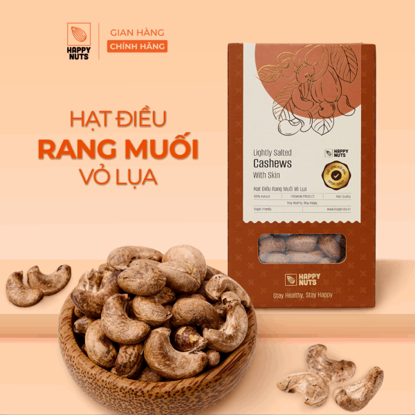 Hạt điều rang muối (còn vỏ lụa) nhà Happy Nuts, với 100% nguyên liệu được chọn lọc từ Bình Phước, vùng đất có chất lượng hạt điều ngon nhất thế giới. Hạt điều được rang củi thủ công với 0,05% muối nhằm giữ nguyên vị và tạo hương vị thơm ngon.