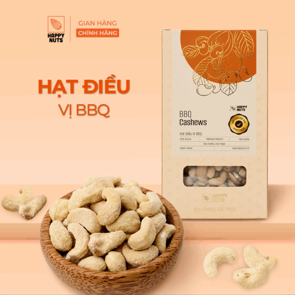 Hạt điều vị BBQ nhà Happy Nuts được chọn lọc kĩ càng từ vùng nguyên liệu Bình Phước với chất lượng tốt nhất. Mỗi hạt được phủ một lớp mỏng gia vị BBQ sau đó nướng ở nhiệt độ thích hợp, mang đến hương vị thơm thơm, béo béo đặc trưng vị BBQ cực kì kích thích vị giác.
