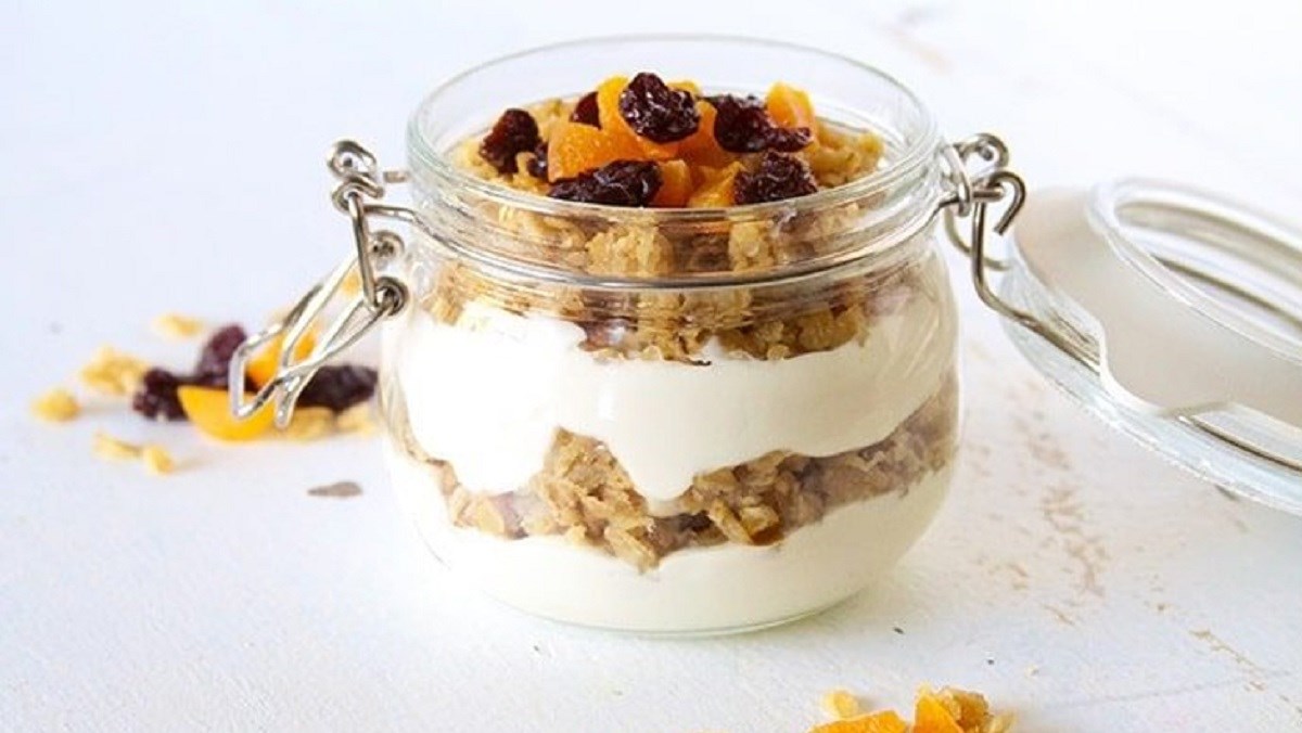 - Cho sữa chua kết hợp với hạt macca và trái cây vào ly và thưởng thức.