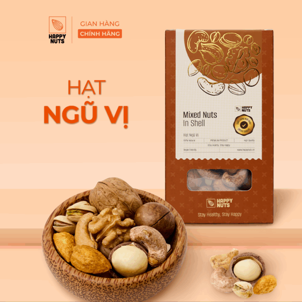 Vì mong muốn sử dụng đa dạng hạt dinh dưỡng nên Happy Nuts cho ra đời hạt ngũ vị (hạt mixed) có thể sử dụng làm hạt ăn hằng ngày. Hạt ngũ vị Happy Nuts là sự kết hợp của 5 loại hạt dinh dưỡng. Nguyên liệu hạt ngũ vị được nhập khẩu và chọn lọc kỹ.
