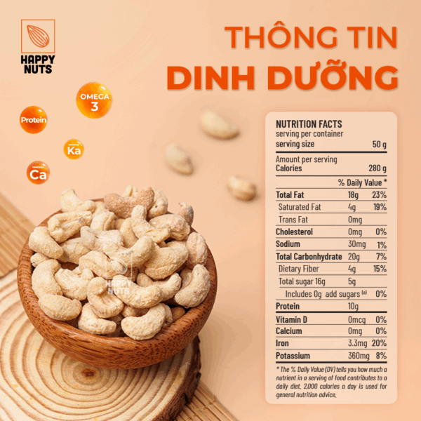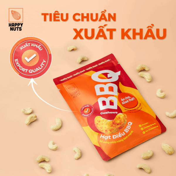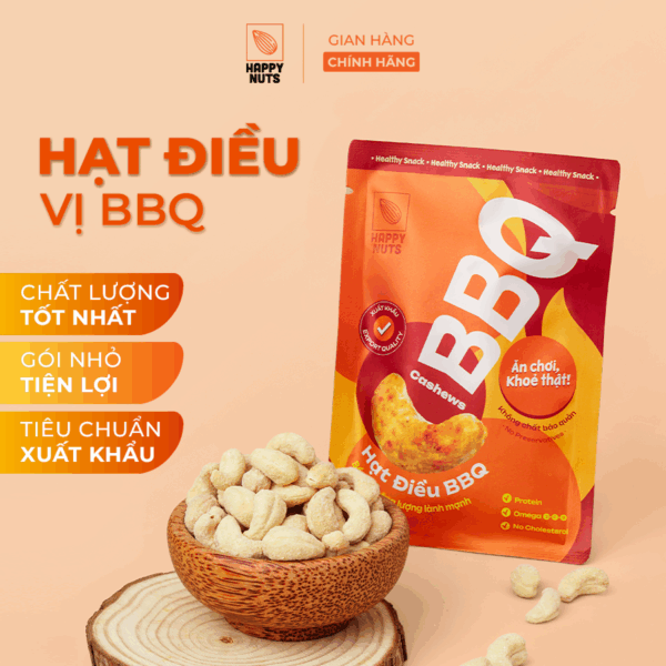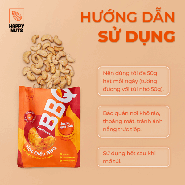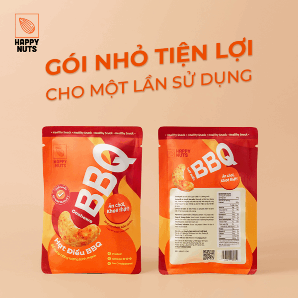 Hạt điều vị BBQ 50g nhà Happy Nuts được thiết kế túi nhỏ tiện lợi cho 1 lần sử dụng. Hạt điều được chọn lọc kĩ càng từ vùng nguyên liệu Bình Phước với chất lượng tốt nhất. Mỗi hạt được phủ một lớp mỏng gia vị BBQ sau đó nướng ở nhiệt độ thích hợp, mang đến hương vị thơm thơm, béo béo đặc trưng vị BBQ cực kì kích thích vị giác.