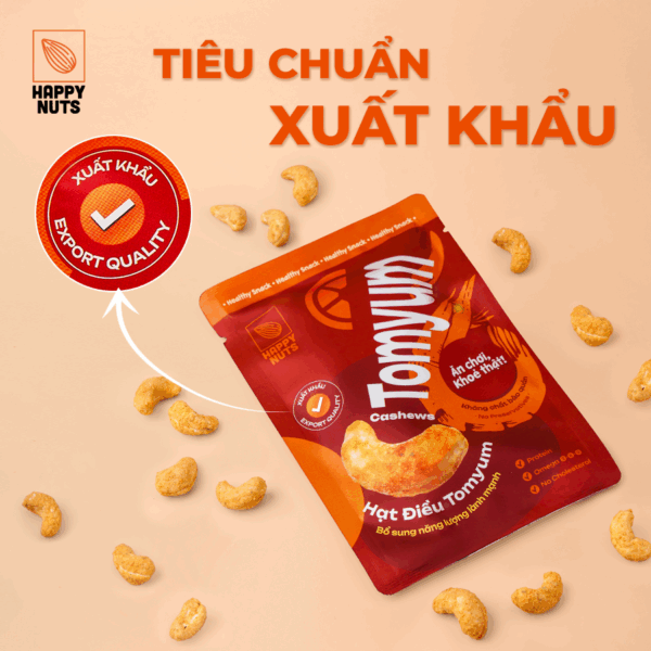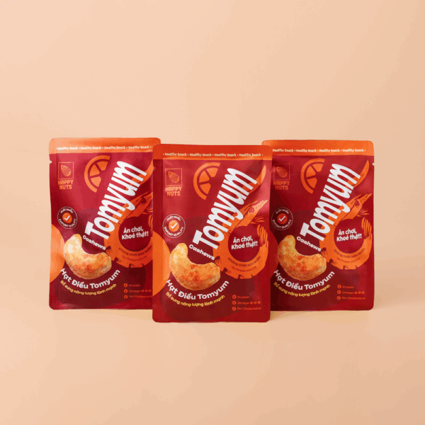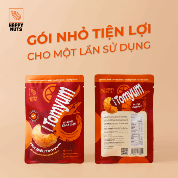 Hạt điều vị Tomyum 50g nhà Happy Nuts được thiết kế túi nhỏ tiện lợi cho 1 lần sử dụng. Hạt điều được chọn lọc kĩ càng từ vùng nguyên liệu Bình Phước với chất lượng tốt nhất. Mỗi hạt được phủ một lớp mỏng gia vị Tomyum đặc trưng, sau đó được nướng ở nhiệt độ thích hợp, mang đến hương vị thơm thơm, béo béo đặc trưng vị Tomyum cực kì kích thích vị giác.