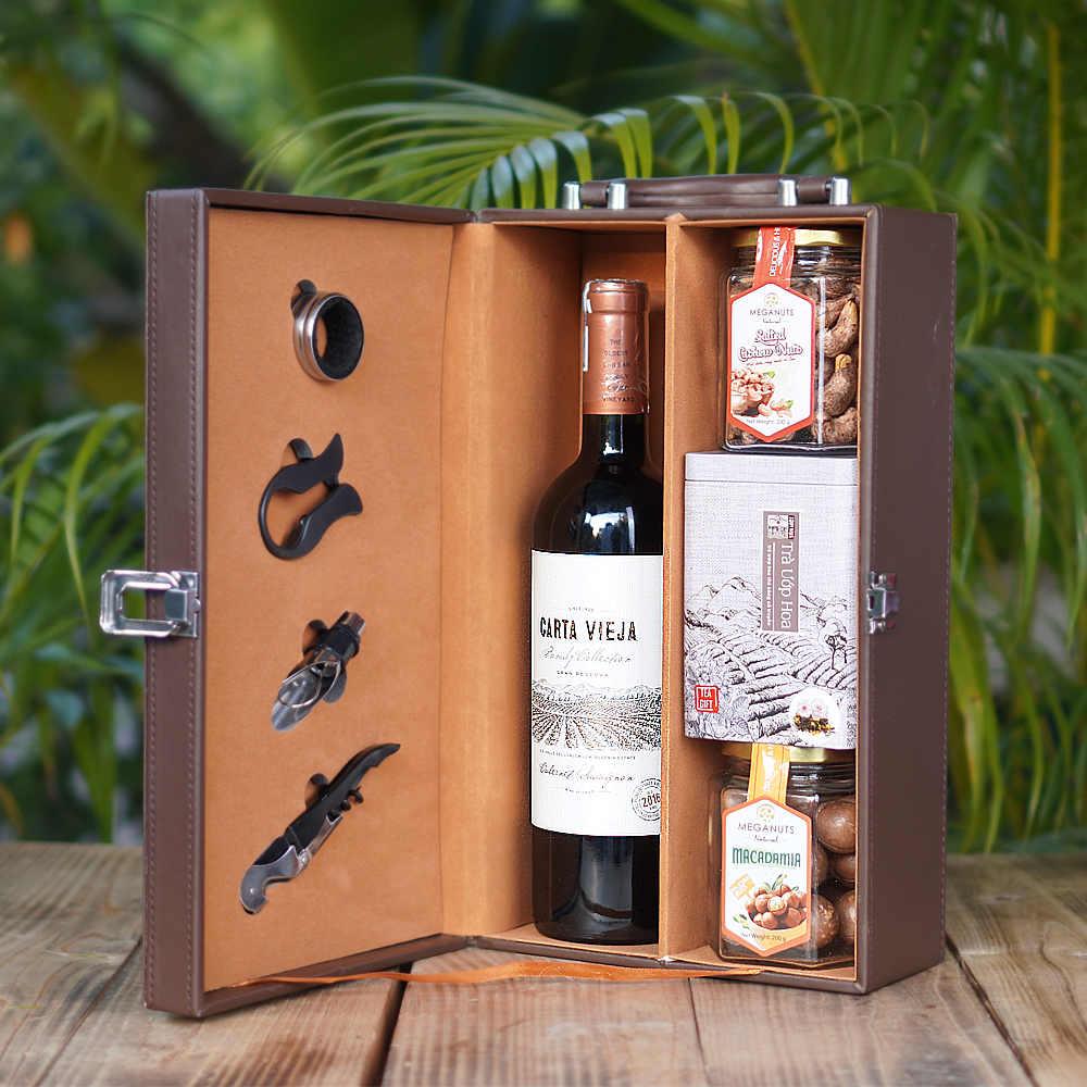Trong hộp quà thường sẽ có rượu vang cao cấp, những món đồ đẹp mắt, sang trọng, nếu là hộp quà tết bằng da thì càng tốt.