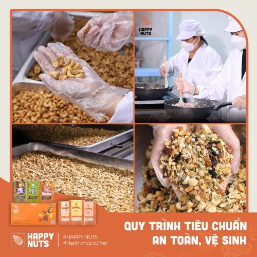 Happy Nuts tự hào là công ty cung cấp các hạt dinh dưỡng và ngũ cốc Granola chất lượng đến từng “đơn vị” hạt. Bởi tất cả nguyên liệu ở đây đều được lựa thủ công để chọn ra những hạt chất lượng nhất, công đoạn chế biến từ trang thiết bị hiện đại, sản phẩm được sấy lạnh để đảm bảo 90% độ dinh dưỡng và khâu đóng gói vô cùng kỳ công cẩn thận.