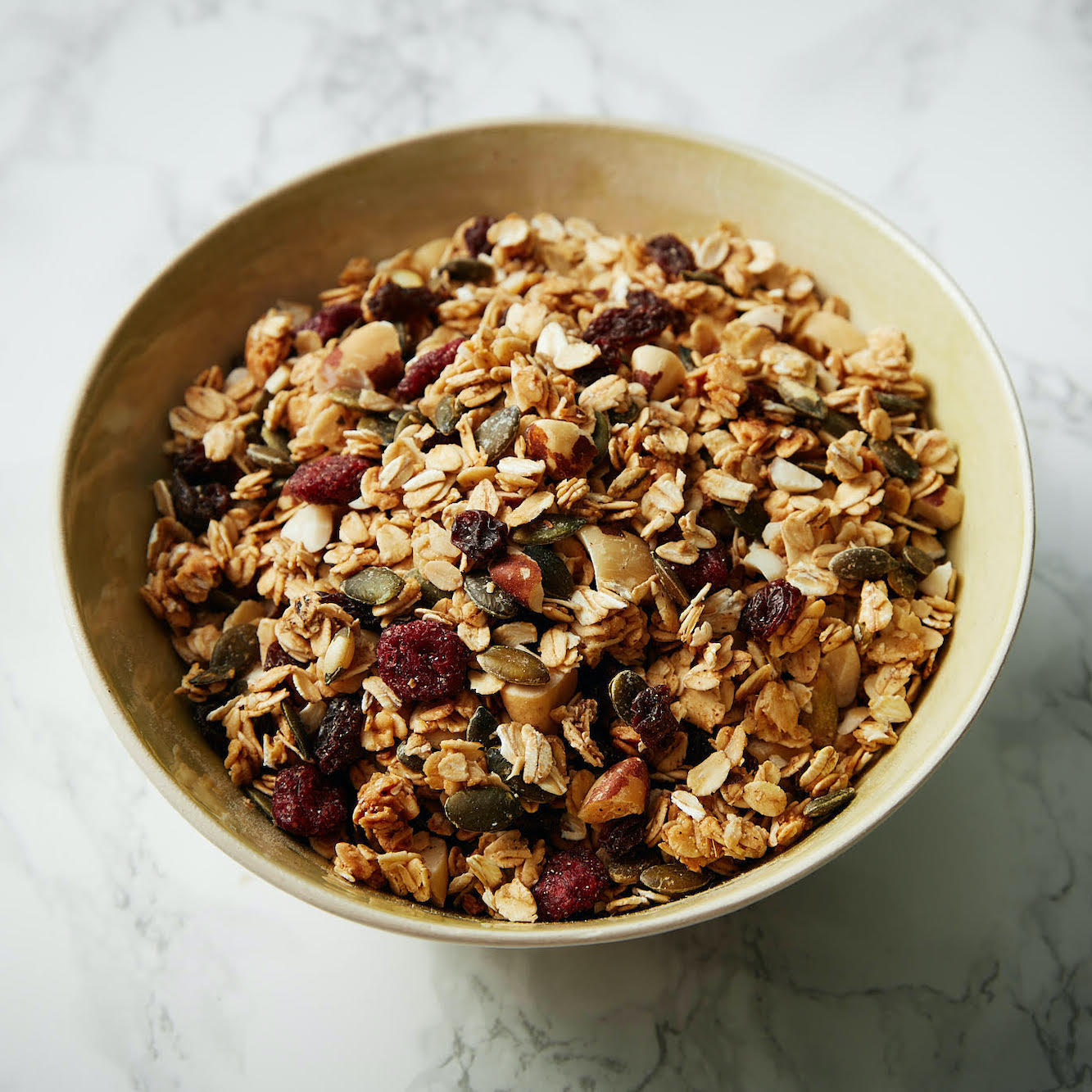 - Trộn đều ngũ cốc granola không đường, hạt hướng dương, hạt hạnh nhân, hạt chia, hạt lựu, muối và hạt vani trong tô lớn.