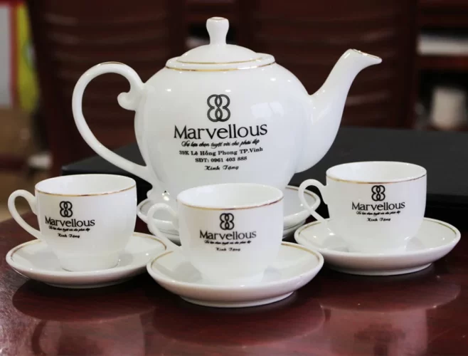 Những bộ ấm chén được ưu tiên lựa chọn nhất. Bởi vừa có giá trị sử dụng cao, vừa có giá trị quảng cáo thương hiệu mạnh mẽ khi phối hợp in logo.