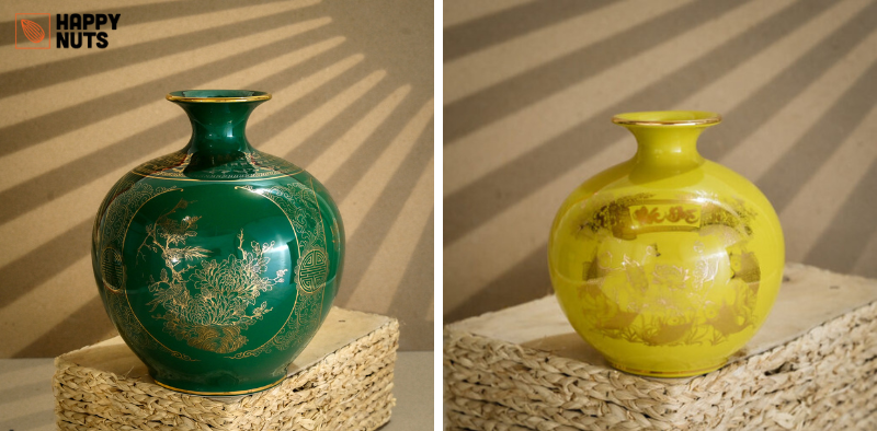 Chất liệu gốm sứ cao cấp dày dặn, nặng tay, trang trí các họa tiết thiên nhiên gần gũi, hoặc phủ men, đắp nổi họa tiết Tài lộc, những cành mai, cành đào… khiến cho món quà này thêm phần rực rỡ, bắt mắt hơn rất nhiều.