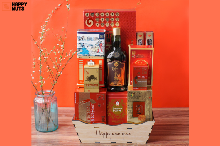 Có thể là trái cây tươi ngon, hạt dinh dưỡng và rượu ngoại cao cấp, hay các loại thực phẩm thượng hạng như: yến sào, đông trùng hạ thảo hay nhân sâm Hàn Quốc,….