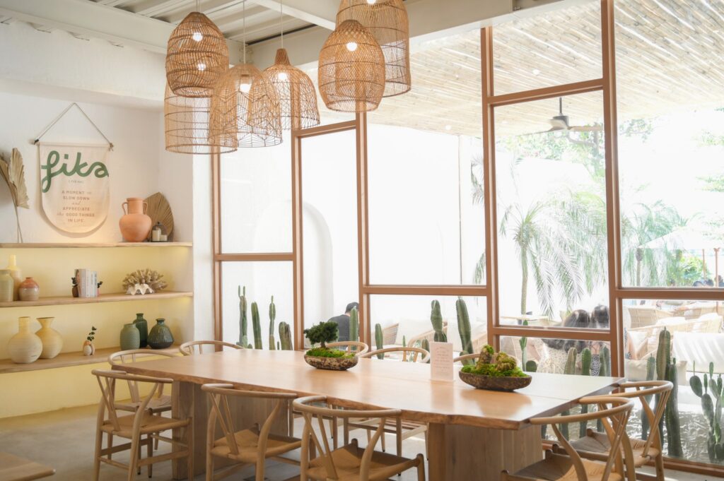 Trong nhà, bàn ghế vẫn vật liệu mây, gỗ nhưng với kiểu dáng đơn giản và ít chiếm diện tích hơn. Bằng cách này, quán có khoảng dư không gian lớn để tạo tính riêng tư và yên tĩnh