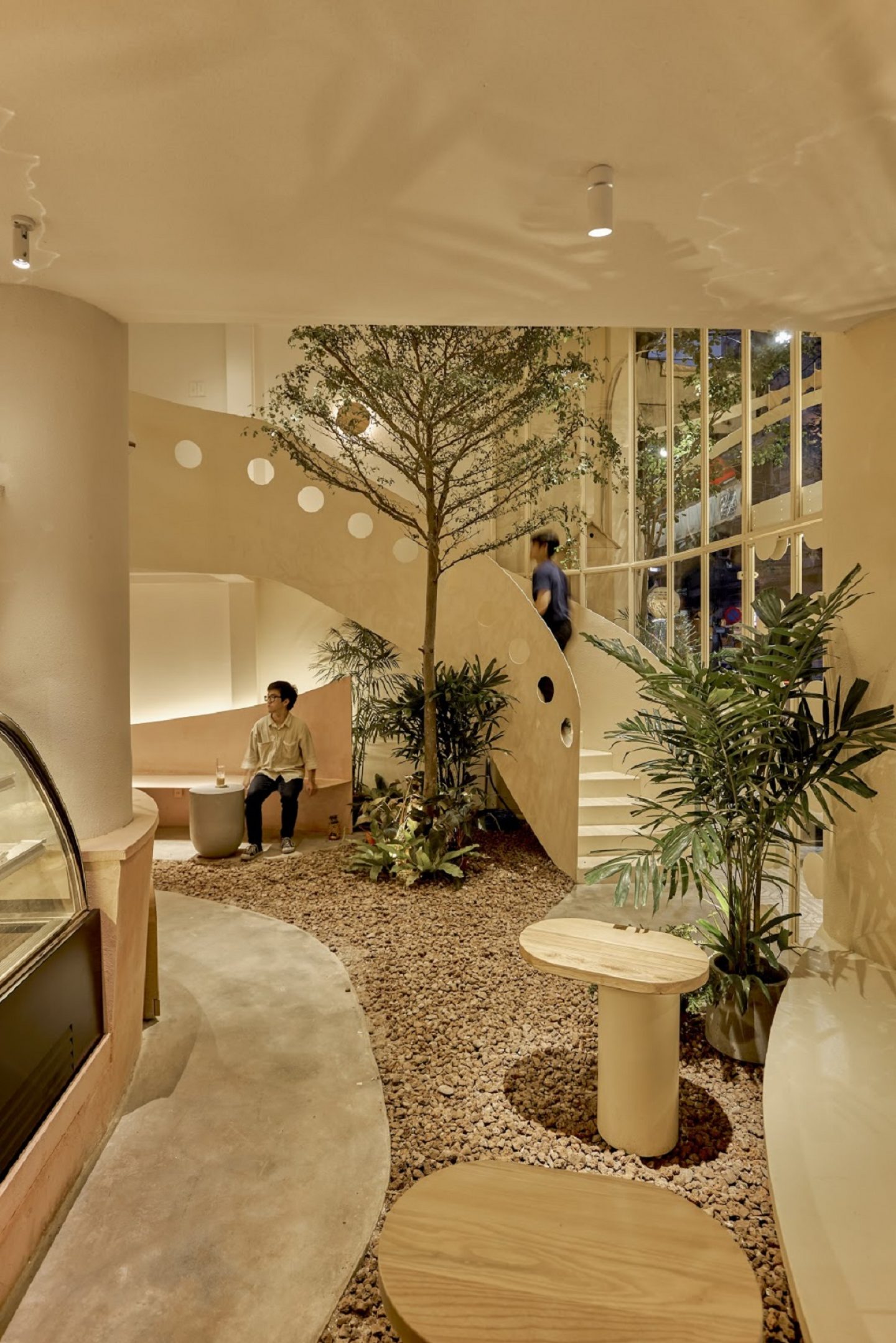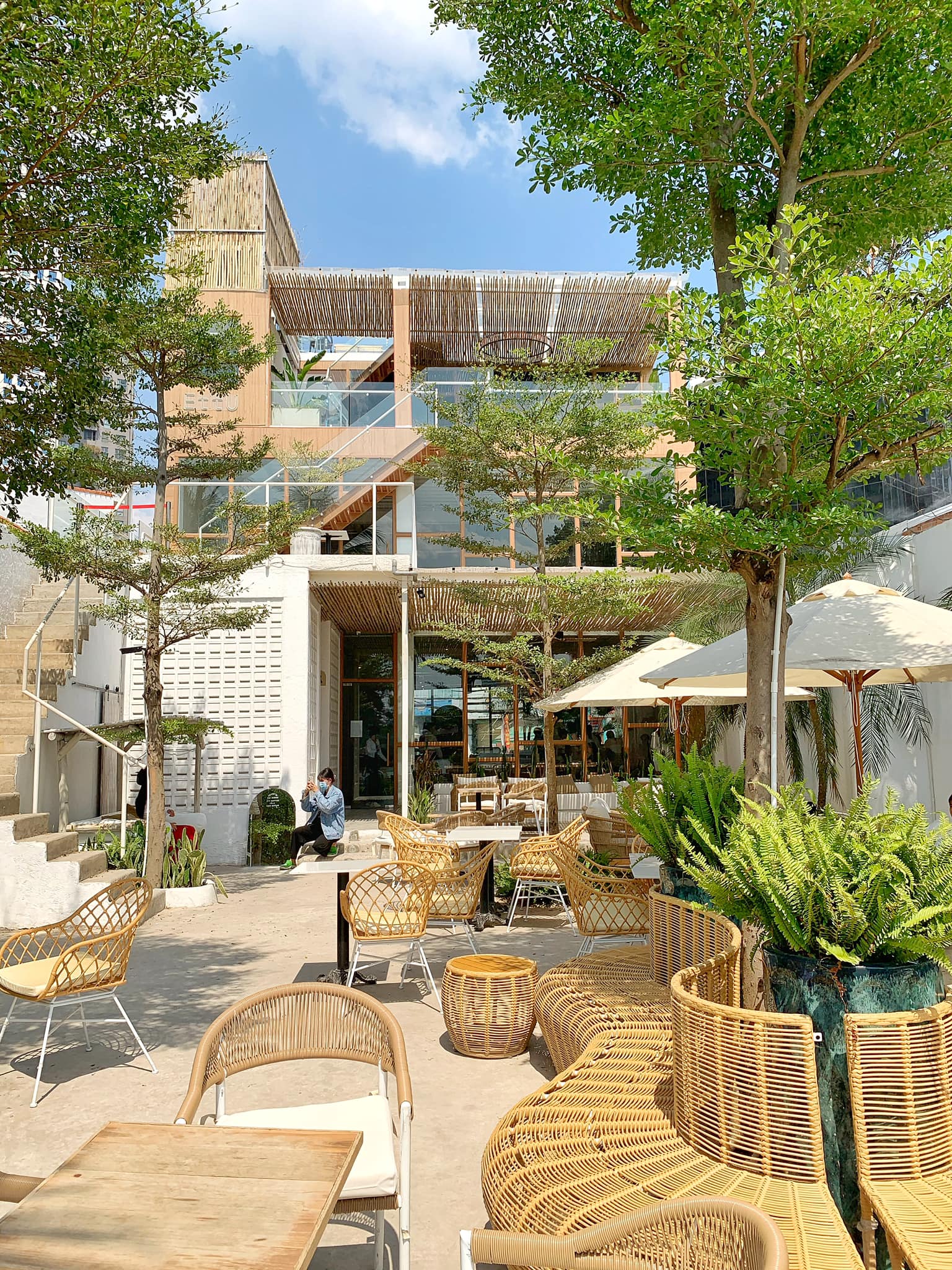 Không gian tối giản nhưng vẫn sang trọng, hiện đại hài hoà với phối cảnh cây cối và bàn ghế xung quanh