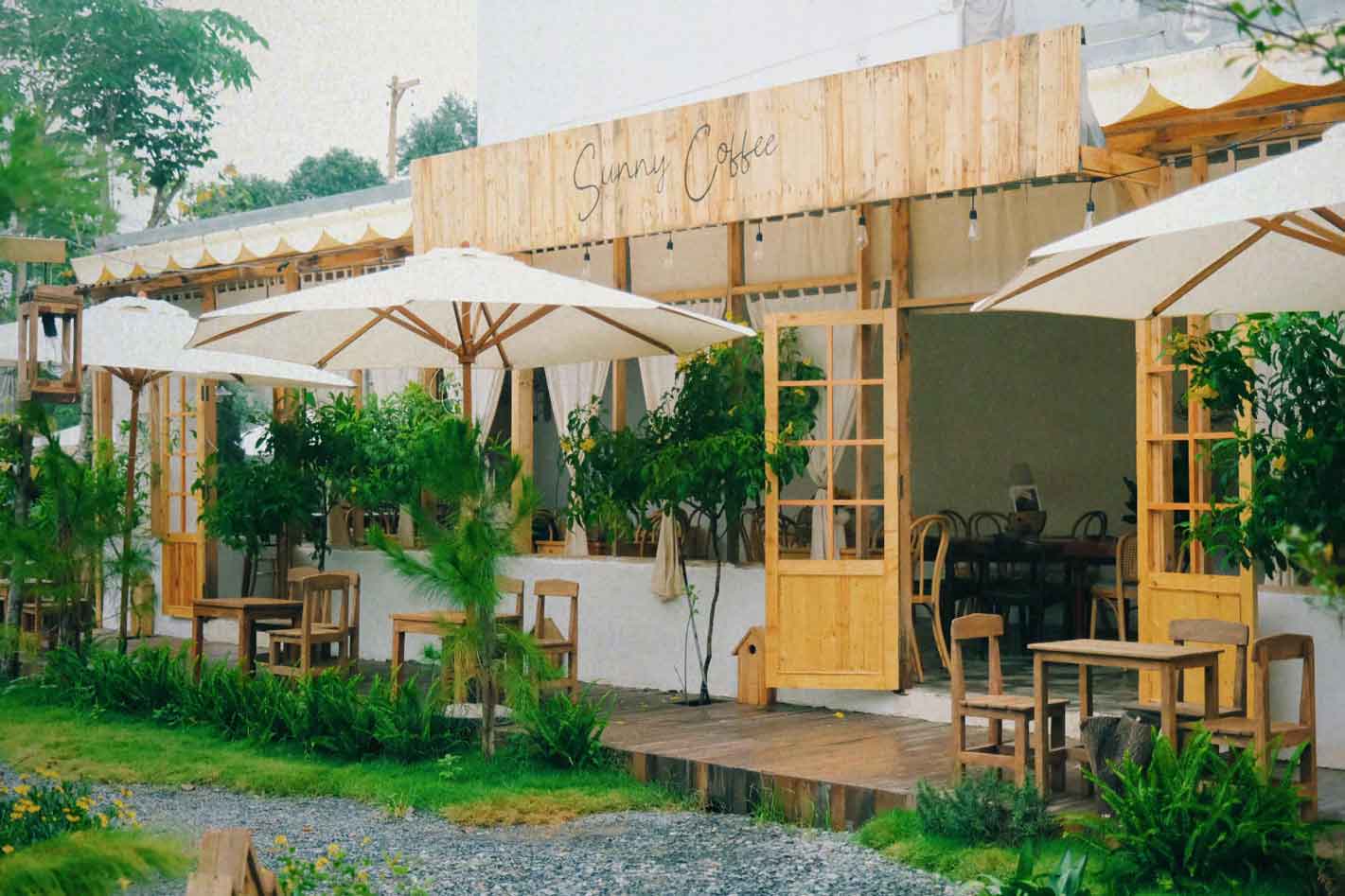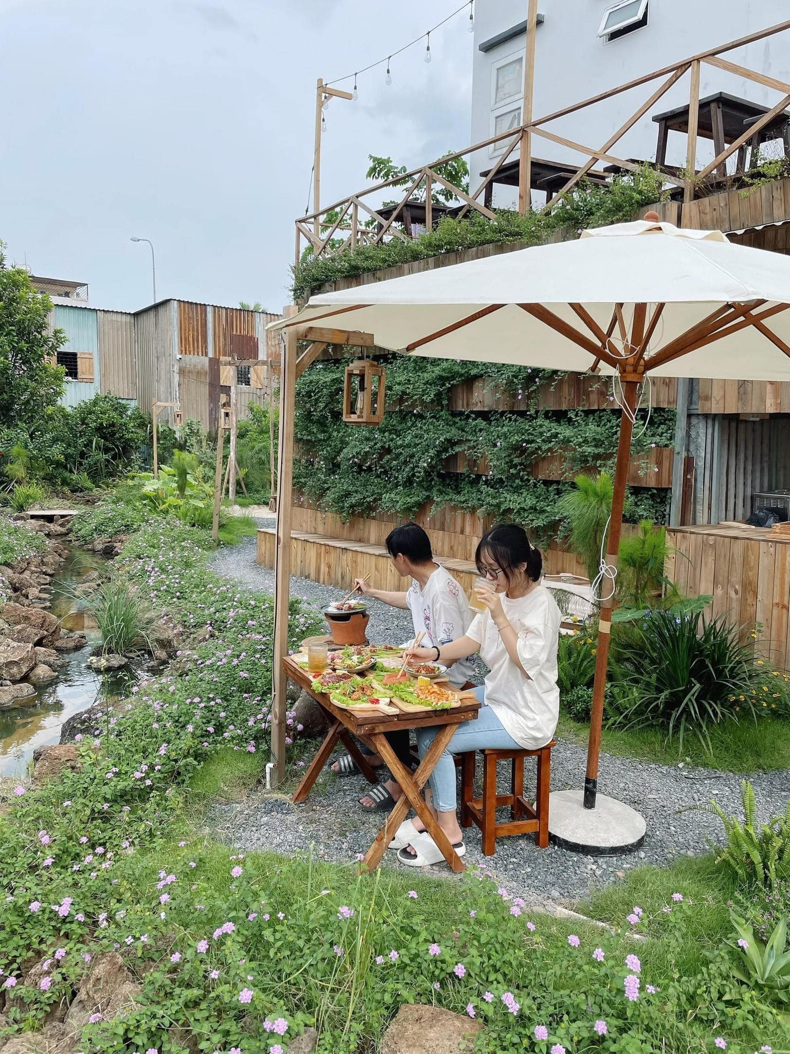 Khu vực ngoài trời thu hút với khoảng sân được trang trí nhiều cây xanh xung quanh, đường đi trải một lớp sỏi trắng, bàn ghế theo style cắm trại nên khá đơn giản, đem đến cảm giác nhẹ nhàng và thoải mái cho khách hàng.