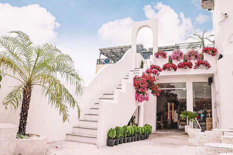 Quán mang phong cách Địa Trung Hải nên tông màu chủ đạo của quán chính là nâu, trắng và xanh lá