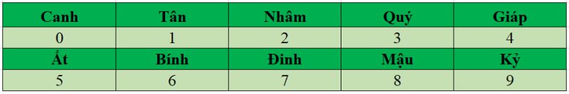 Có 10 thiên can lần lượt là: Giáp (1), Ất (2), Bính (3), Đinh (4), Mậu (5), Kỷ (6), Canh (7), Tân (8), Nhâm (9), Quý (10). Với số lẻ là can dương, số chẵn là can âm.