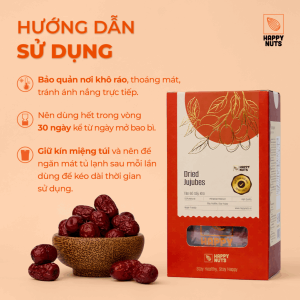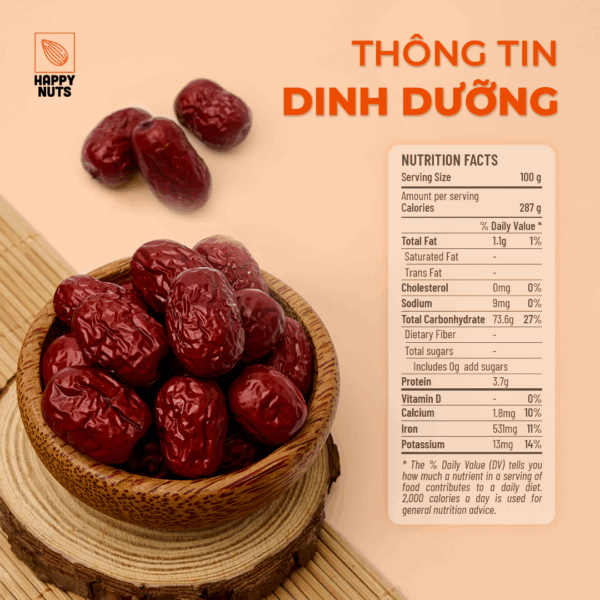 • Chất xơ: Táo đỏ sấy khô giàu chất xơ, giúp tăng cường sức khỏe tiêu hóa, giảm táo bón và duy trì cảm giác no lâu sau khi ăn.