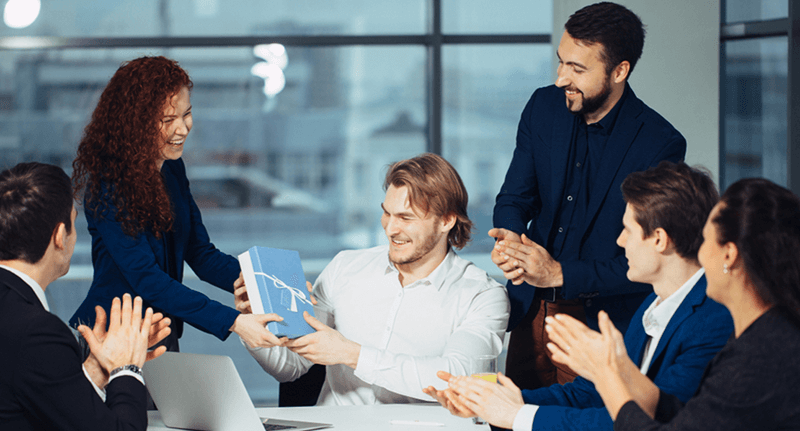 Trao quà bằng hai tay, hơi cúi đầu xuống một chút để bày tỏ sự tôn trọng của mình đối với lãnh đạo.