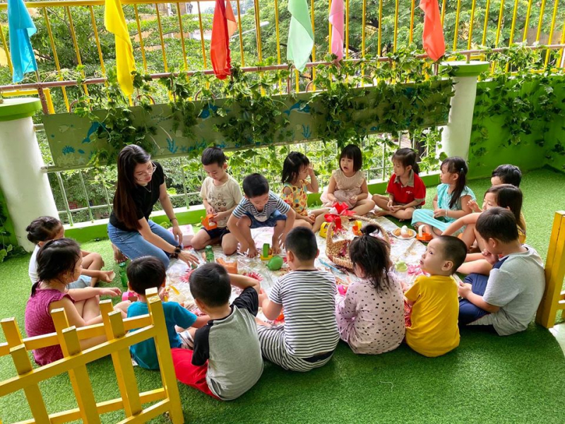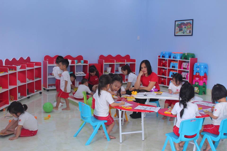 Trung bình mỗi lớp 20-25 bé, 2 giáo viên và bảo mẫu, giáo viên có thể chăm sóc, quan tâm tới từng bé.